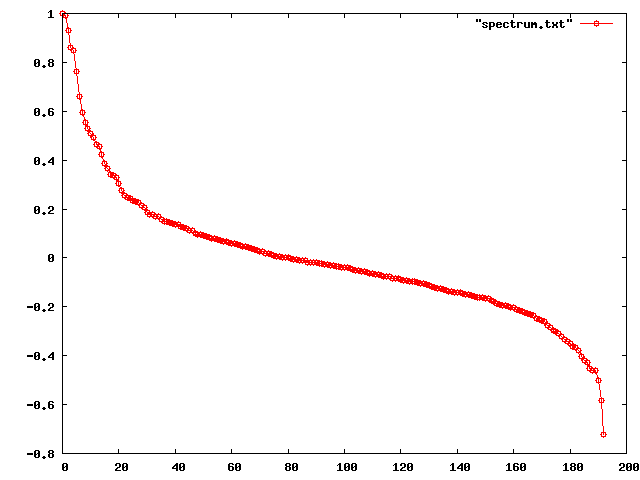 Most of the eigenvalues are accumulated on the positive side (this graph really seems far from being bipartite). Another interesting question if: how can we interpret the shape of this curve. Which characteristics from the graph can we get? I still don’t know how to answer this questions, but I think